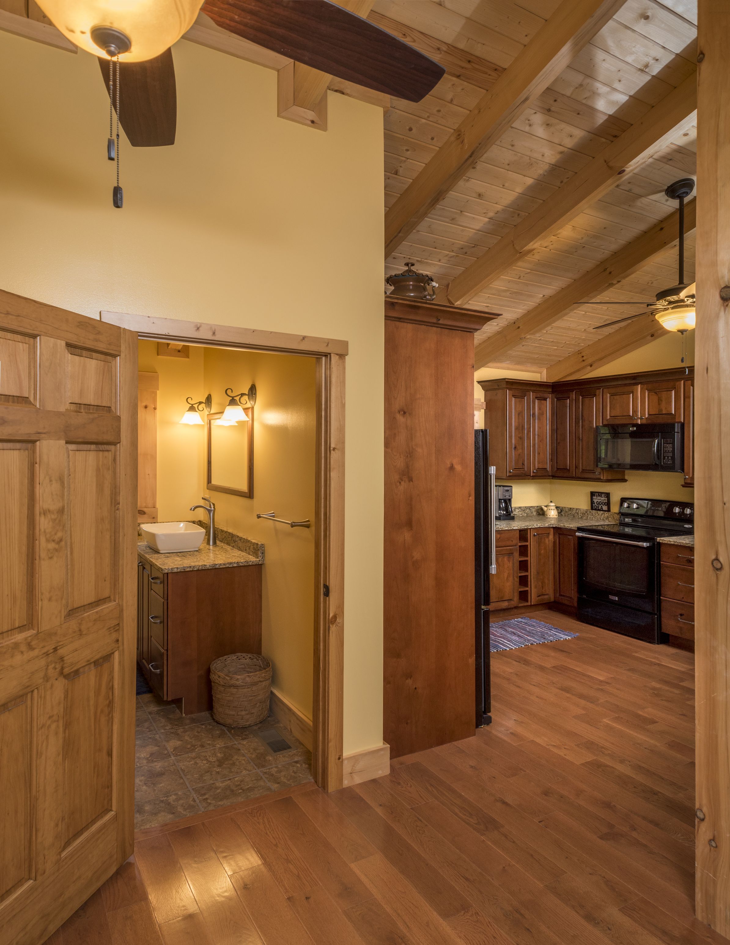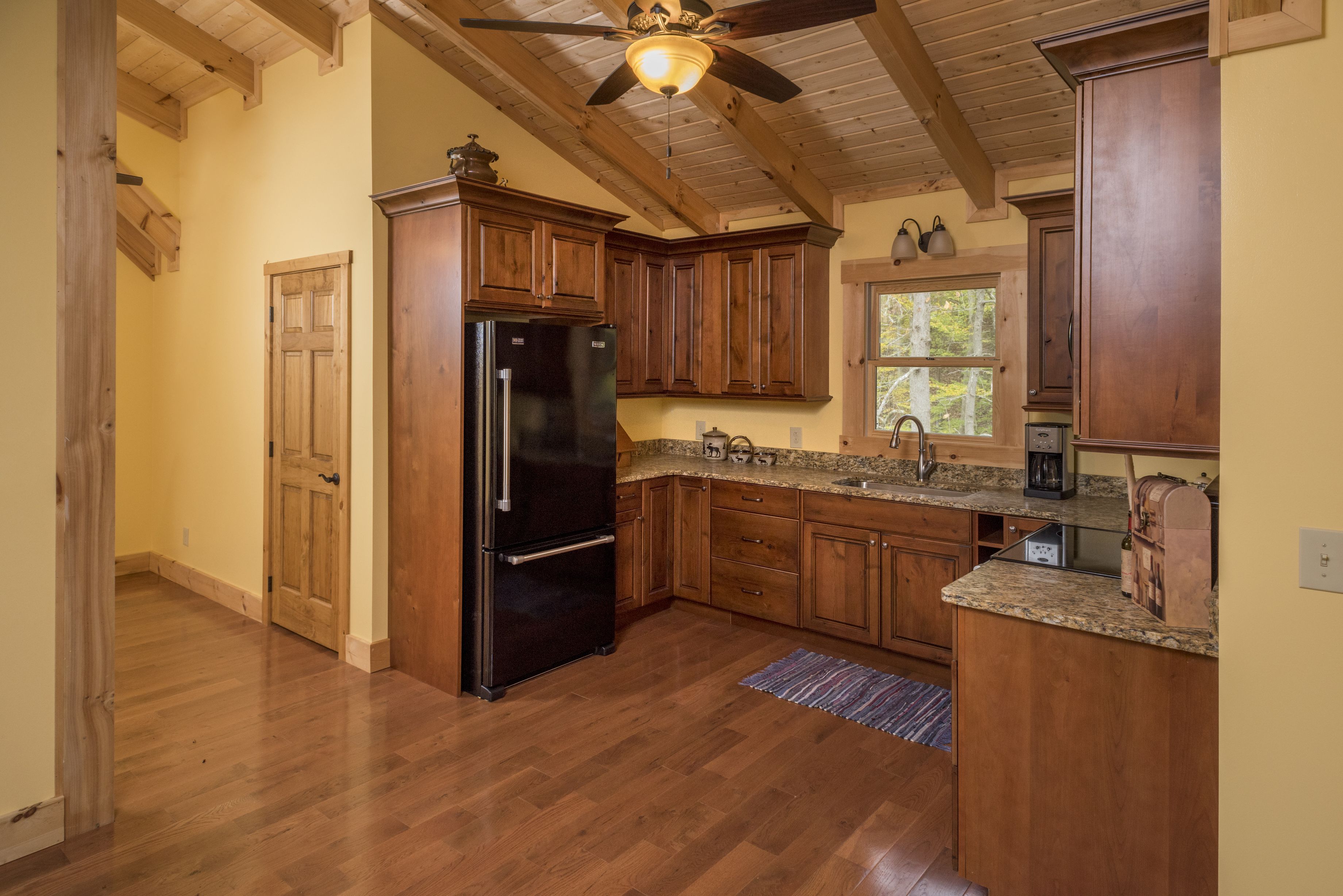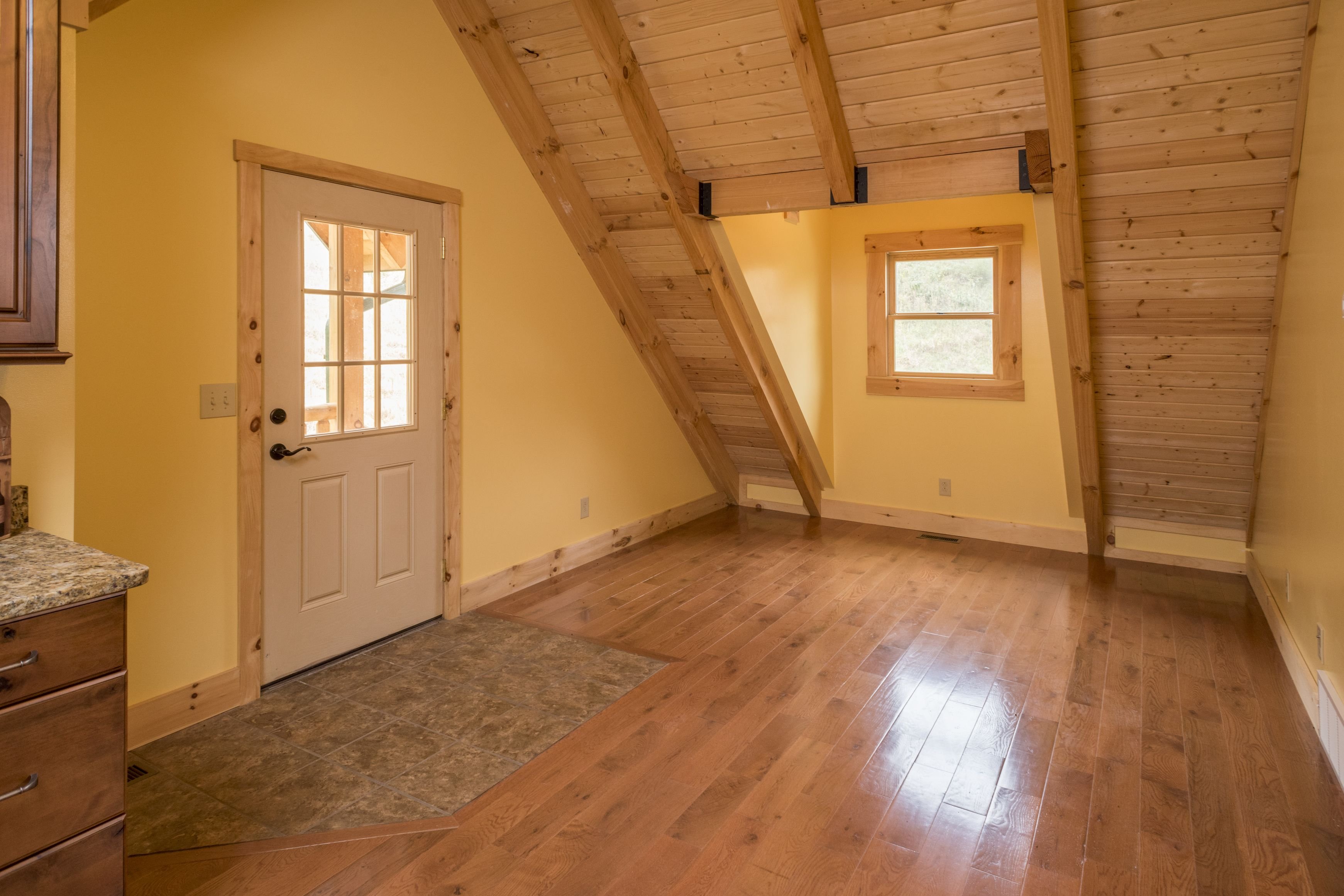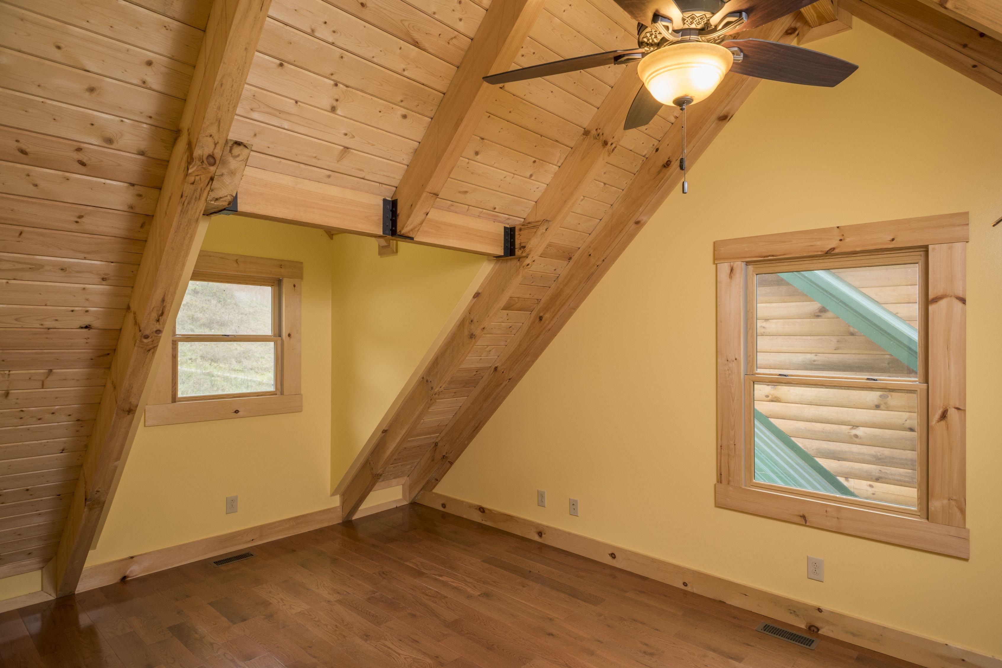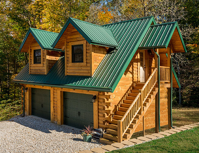 This full log garage features two bays and a side entry door for convenience. Stairs lead to a second story cottage with living area, bedroom and bath that could be used for a rental unit or an open bonus room. Twin window dormers add some charm and make this a great addition to a log home package or build beforehand to live in and store materials and tools.