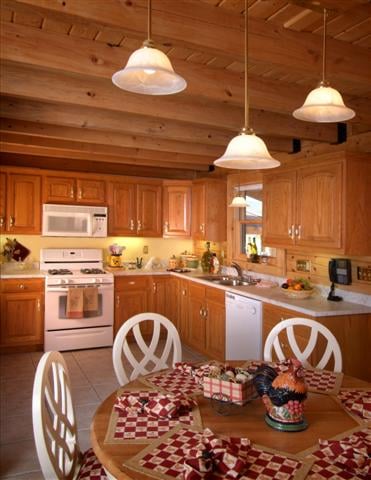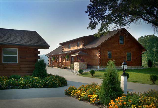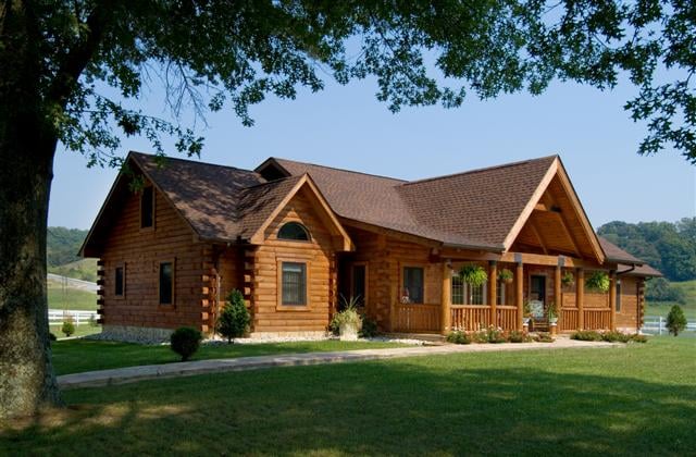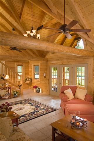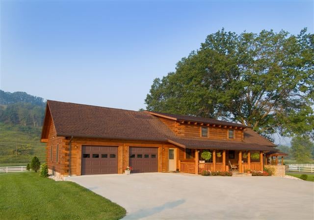 The Greenbrier II log home exudes a distinguished contemporary design with lots of light and airy spaces. A striking array of gables, abundant windows and all glass entry door let the sunshine in. Multiple intersecting roof lines and a compact two bedroom loft give this home indisputable curb appeal. The oversized main floor bedroom with full bath and walk in closet are covered by a soaring cathedral beamed ceiling. The double attached garage opens into the living area of this beautiful design. Stroll outside and enjoy the evening sunset from the open front deck or back covered porch.