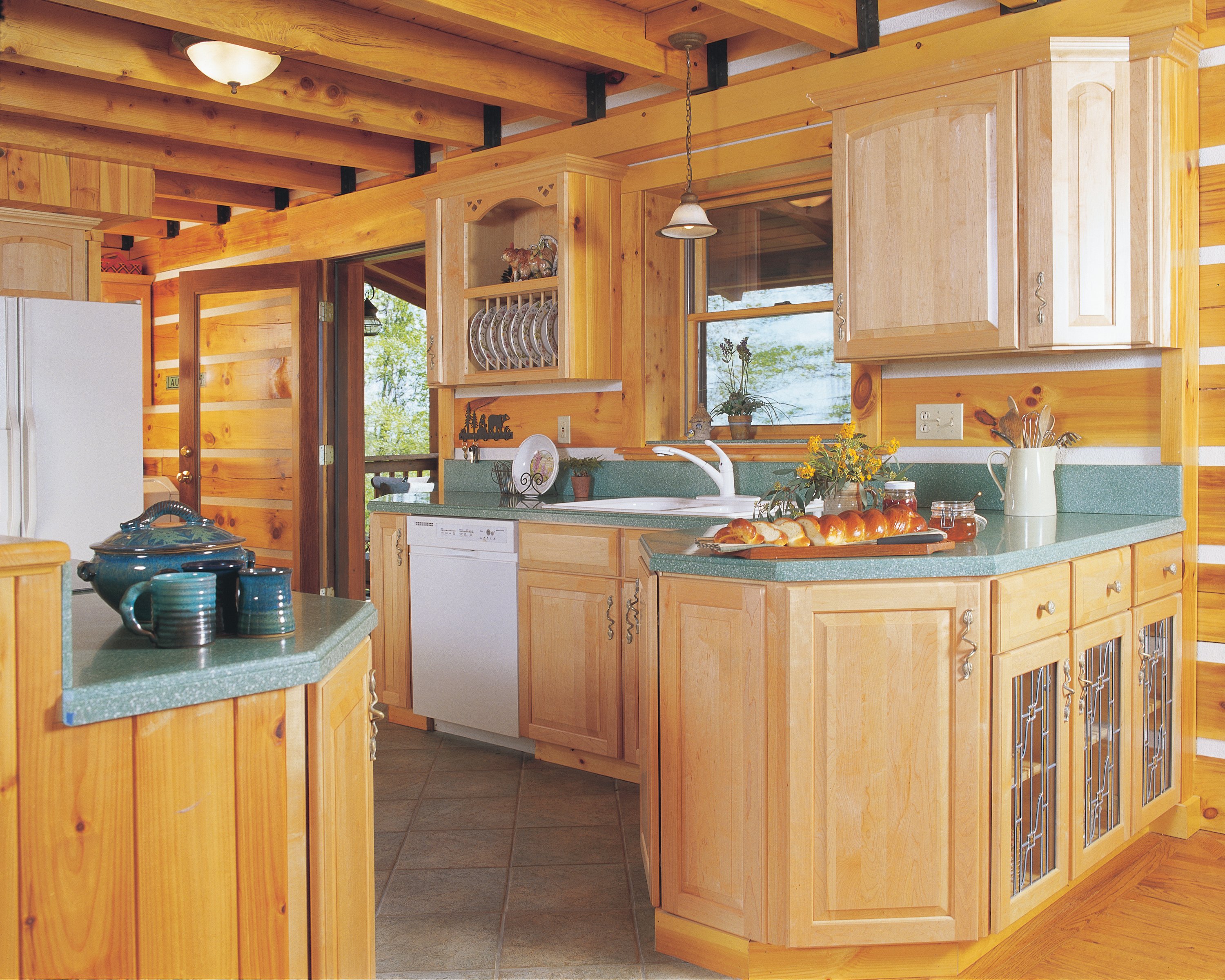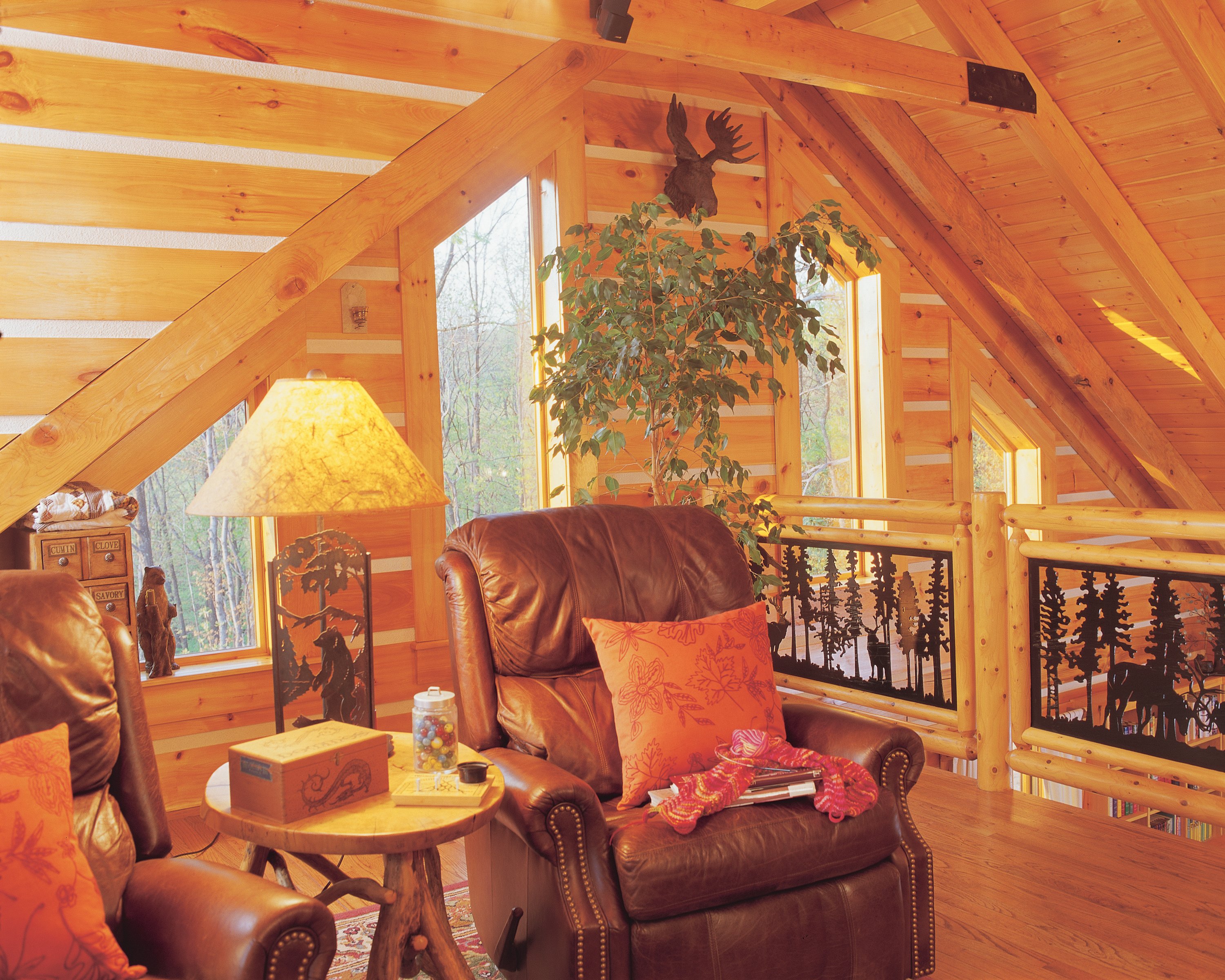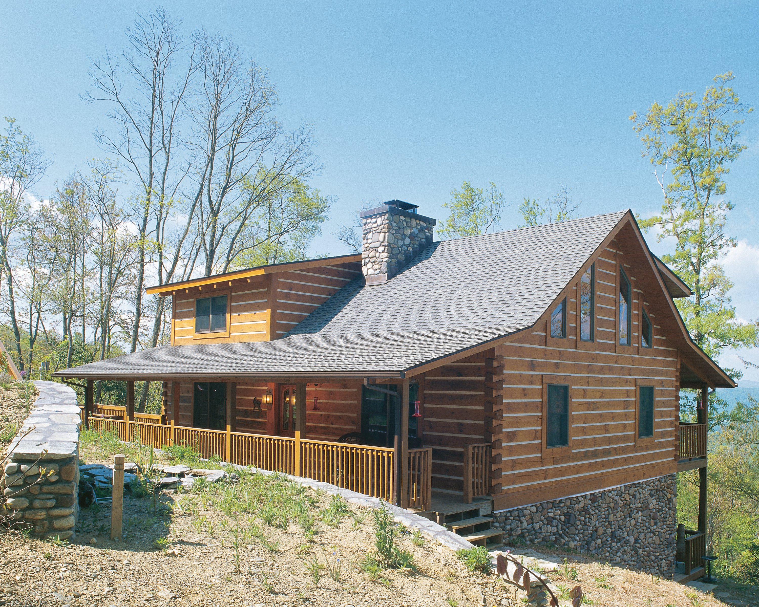 The Jefferson log home is a one and one half story design that is enhanced with many stylish features in an all-time traditional floor plan. It has three bedrooms, two and one half bathrooms, and an open living space featuring open beam A-style roofline. The main floor bedroom provides privacy with an adjacent bath. The kitchen and handy utility area open to a deck. Wide porches multiply outdoor living area for entertaining.